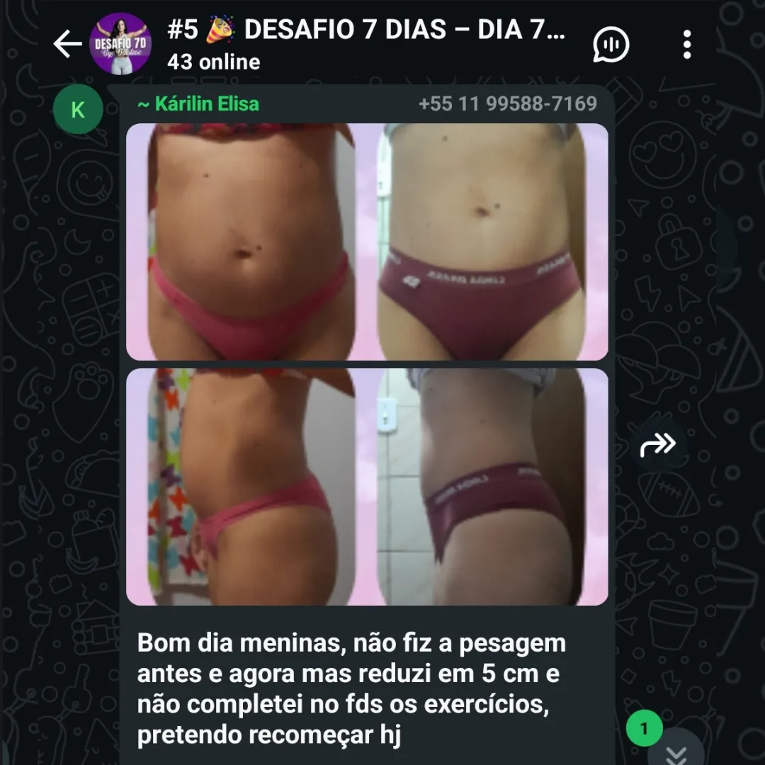 Esse não é um desafio comum. O Desafio Bye Diástase será transformador na sua vida. São Treinos de baixa intensidade, porém muito efetivos. Se você seguir as minhas instruções, você perderá 4cm de barriga em uma semana! A partir da próxima Segunda-feira, você receberá pelo WhatsApp os treinos e vídeos com meu Método que foi considerado um dos 3 Melhores Programas de Tratamento em Diástase do Brasil.