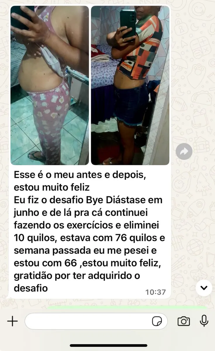 Este programa foi utilizado por mais de 100.000 alunas de todo o Brasil. São Mulheres que querem tratar a diástase e estão em busca de uma coisa séria. Este método que você vai começar nessa Segunda-feira funciona para Todas as Idades, independente do seu peso atual e mesmo que você esteja sedentária há muito tempo ou não tenha força de vontade. Tudo acontecerá em 7 dias. Todos os Treinos, Vídeos e Aulas serão enviados para você pelo WhatsApp e você poderá fazer os treinos e assistir às aulas extras em qualquer horário do seu dia.